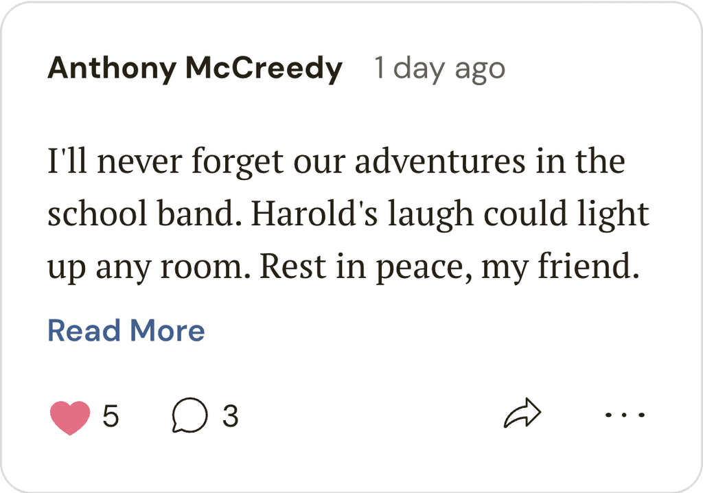 I still can’t quite believe Harold’s gone. We met on the first day of second grade—he offered me half his peanut-butter sandwich after I dropped mine in the dirt—and, from that instant, our lives stitched themselves together. I watched him grow from the skinny kid who could outrun everyone at recess into the lanky teenager who tuned his old Fender until the garage trembled, swearing he’d someday play to crowds larger than the map of our hometown.